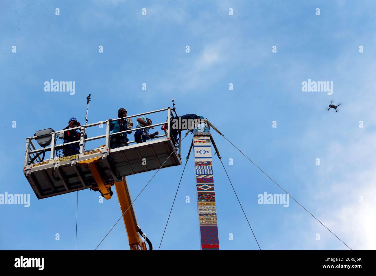 Workers On A Crane Assemble The Last Parts Of A 36 Meter 118 Feet Tower In An Attempt To Break The Guinness World Record For The Highest Building Blocks Structure In Tel Aviv